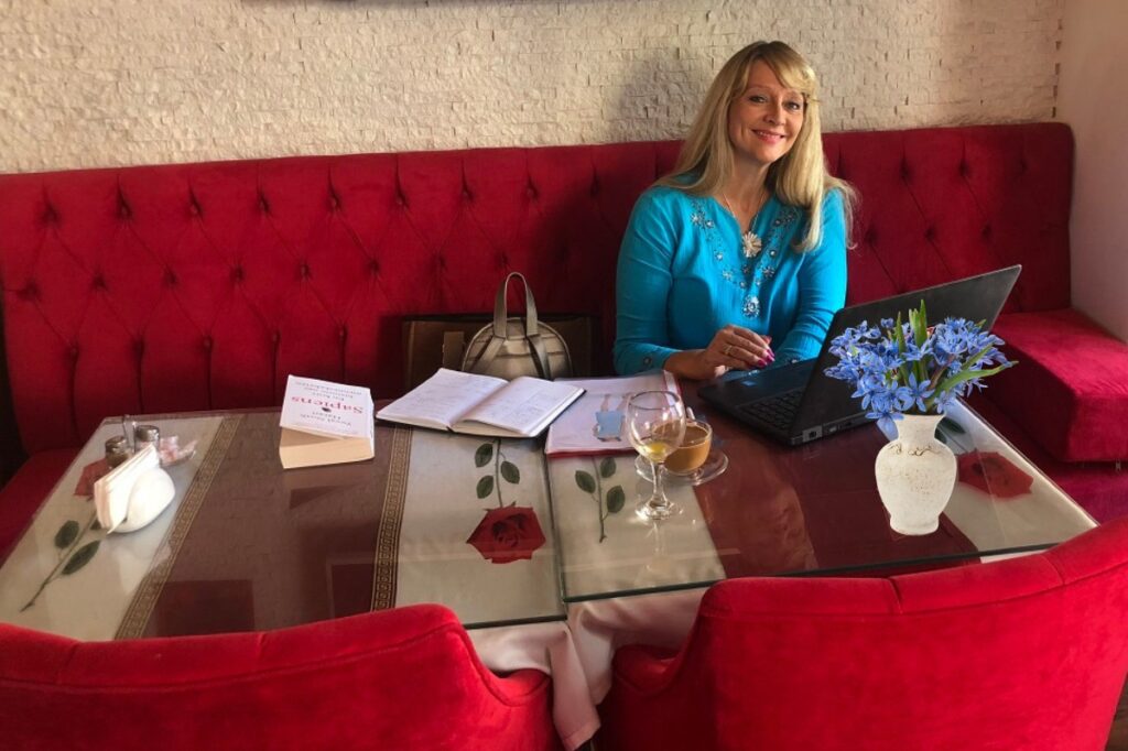 Charm Hotel ble mitt andre hjem. Jeg fikk et hjørne i frokost restauranten som kontor, tok av meg stilettene og fløy i trappa med skoene i hendene. Kokken valgte fisk til meg, resepsjonisten lærte meg Uber – og manageren gav meg idéer jeg tok med hjem til Norge. Her sitter jeg i kontorhjørnet mitt.